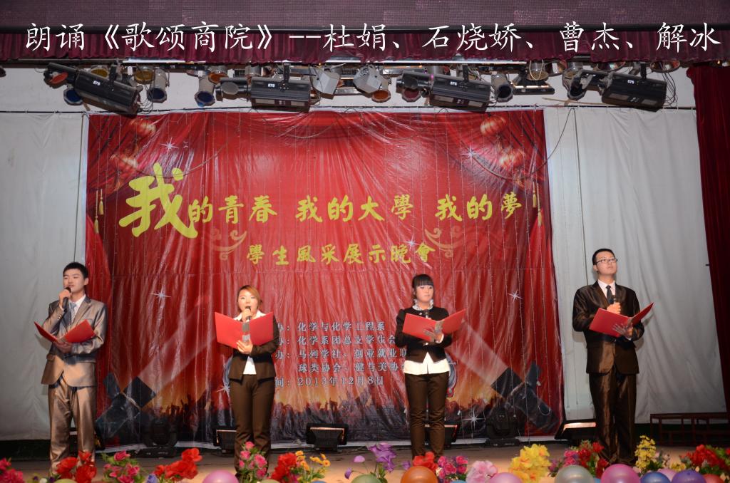 本次晚会以文艺节目多样,师生共同演绎了歌曲、舞蹈、小品等节目。围绕主题“我的青春、我的大学、我的梦”展开,节目体现了“积极、向上、活泼、激情”校园文化氛围,整个节目表演过程中,现场氛围活跃,高潮不断,掌声不断。舞蹈《弧月》以独特的背景,展现了少数民族的风情;刘佳佳同学一曲化学版的青花瓷以其独特的歌词向观众唱出了一些基础的化学知识,获得好评;王宪生教授的一曲《再见了大别山》将晚会推向高潮,掌声不断,未下场即被邀请返场,在广大师生的欢呼声中又奉献了一首《儿行千里母担忧》,由生活部改编的舞蹈《甩动青春》以甩葱歌为基调,将当下多种流行元素结合起来,让晚会现场笑声不断;最后一曲送给14届毕业生的《商洛学院的日子》让在场的学生感慨不已,纷纷表示感谢老师过去4年的培养,珍惜自己在学校的最后一段时光,为母校的发展贡献自己的绵薄之力。