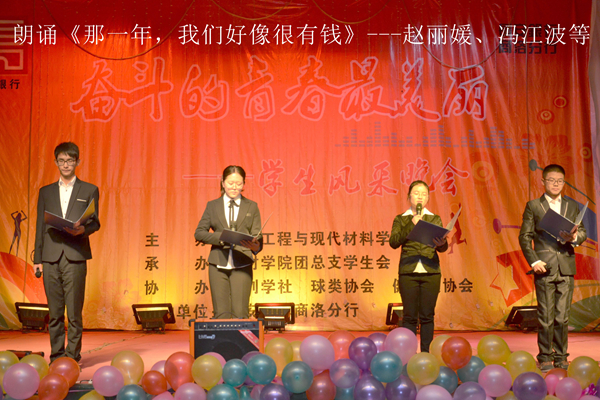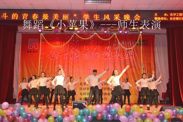 舞起醉人的红绸,敲响震天的锣鼓,伴随着舞蹈《开门红》,晚会正式开始。开场舞«开门红»令广大师生感受到了新年临近的喜庆。王强等同学的街舞秀引爆全场。王老师的«西部情歌»令同学们为之喝彩。相声«学富五车»令全场笑声不断。小品«我爱化学»则将化材院的专业以艺术的形式呈现给大家。更有武永耿等老师与同学们合演的舞蹈«小苹果»,让大家大饱眼福。
