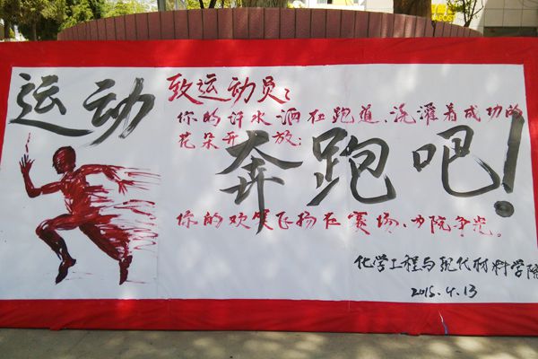 运动会的赛场上,我们化材院的所有同学将为你们呐喊助威。我们用眼睛见证赛场上的是非成败,用心灵感受了运动员的喜怒哀乐。人生的路,有坦途,也有坎坷,走过的岁月,有欢笑,也有苦涩。人生要自己去拼搏与奋斗,在风雨中百折不饶勇往直前,成功属于那些战胜失败、坚持不懈、勇于追求梦想的人。加油!加油!化材院的运动健儿们,你们是最棒的。
