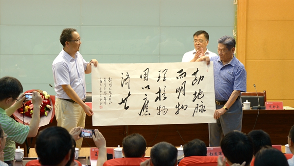 党委书记龙治刚在讲话中以“中国地质科学的领头羊”“中国地质教育的垦荒牛”高度概括了赵鹏大院士在中国地质学家的声誉和影响力,向师生介绍了赵鹏大教授1949年参加开国大典,1957年作为留苏研究生在莫斯科大学聆听毛泽东主席演讲的“人生经历的两个巅峰时刻”。龙治刚指出,赵鹏大院士受聘我校“双聘院士”以来,带领团队为我校的学科专业建设、科学研究、人才培养等方面给予了大力的支持和帮助,又决定出资50万元设立“赵鹏大院士奖教金”,这是赵院士对我校的厚爱和信任,也是对我校在新形势下实现持续发展的鼓励和激励,必将对学校发展产生深远影响。