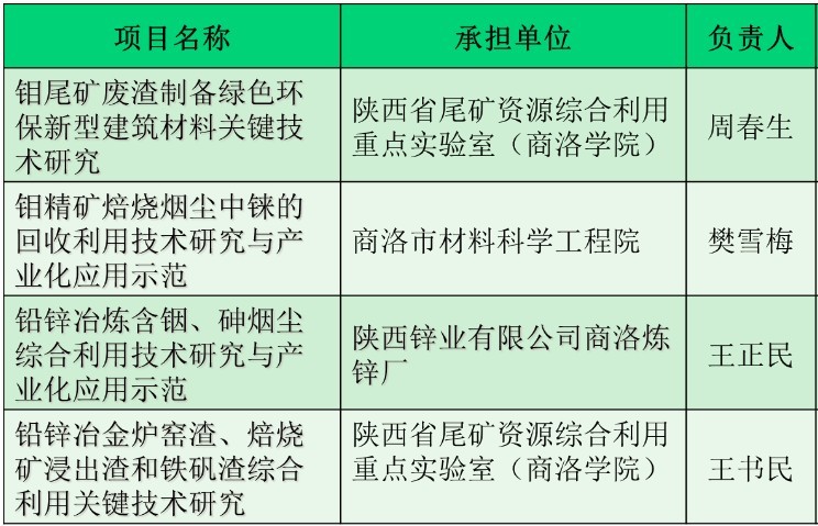 项目简介:陕西省科技统筹创新工程计划地方重大专项——商洛市典型尾矿资源综合利用关键技术研究与产业化应用示范,项目以商洛市典型的钼尾矿废渣、钼精矿焙烧烟尘、铅锌冶炼含铟、砷烟尘、铅锌冶金炉窑渣、焙烧矿浸出渣和铁矾渣的综合利用关键技术为主要研究内容,并进行产业化应用示范。