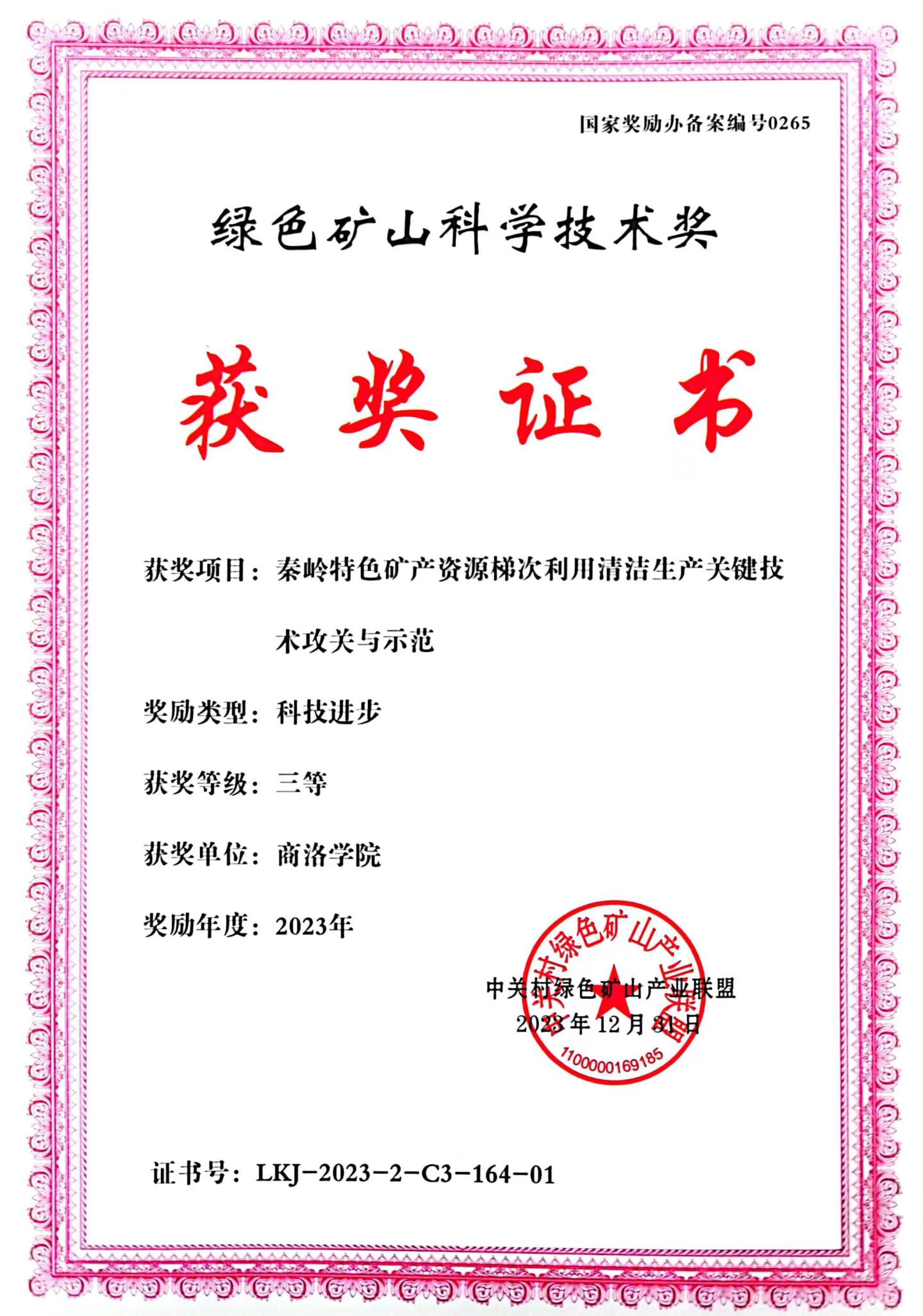 近日,2023年度绿色矿山科学技术奖颁奖大会在北京召开,化材学院组织申报的“秦岭特色矿产资源梯次利用清洁生产关键技术公关与示范”喜获绿色矿山科技进步三等奖。