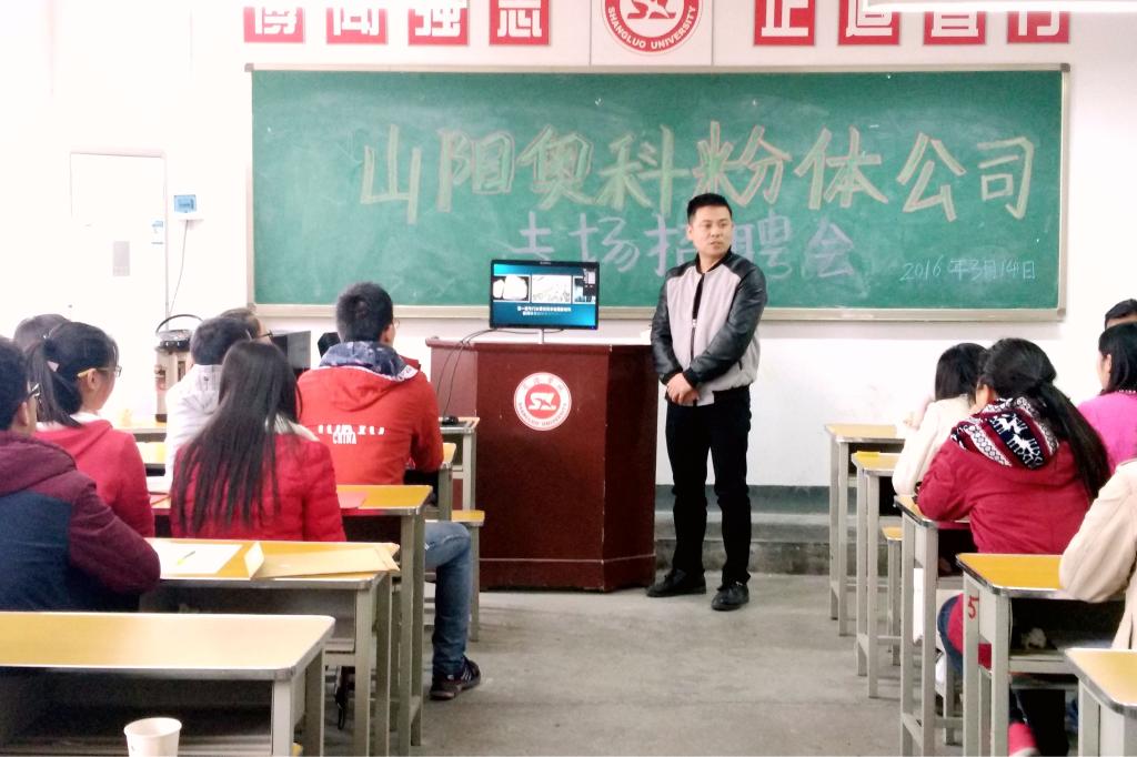 2016年3月14日,山阳奥科粉体有限公司来我院招聘优秀毕业生。下午14:30,在5—307教室我院化学、应用化学、金属材料工程、应用化工技术等专业32名大四学生齐聚一堂,参加山阳奥科粉体有限公司的招聘会。