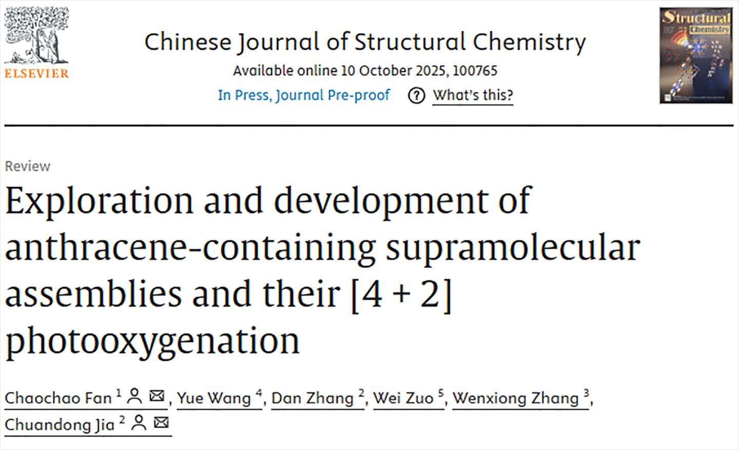 2025年10月10日,我院青年教师范超超博士的研究论文《Exploration and development of anthracene-containing supramolecular assemblies and their [4 + 2] photooxygenation》在权威学术期刊《Chinese Journal of Structural Chemistry》在线发表。范超超博士为该论文的第一作者兼通讯作者,我校为第一完成单位。