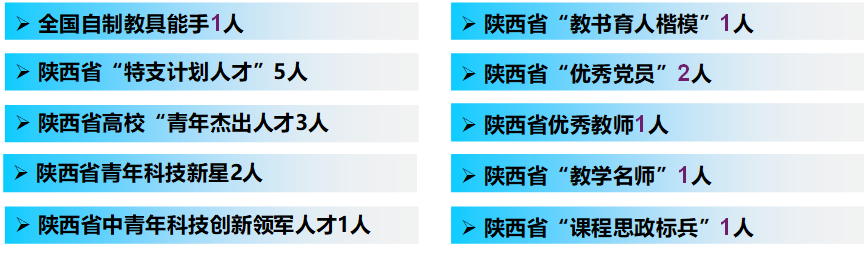 师生共研,发表学术论文22篇,学生参与授权专利14件,获全国中小学优秀自制教具一等奖1项,教育部教育装备研究与发展中心自制教具一等奖1项,陕西省基础教育自制教具类教学成果一等奖3项,二等奖4项,获批陕西省高等教育教学成果一等奖2项,二等奖1项,商洛学院教学成果一等奖1项,二等奖1项。