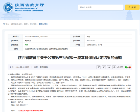根据陕西省教育厅关于公布第三批省级一流本科课程认定结果的通知,我院两门课程获批立项。